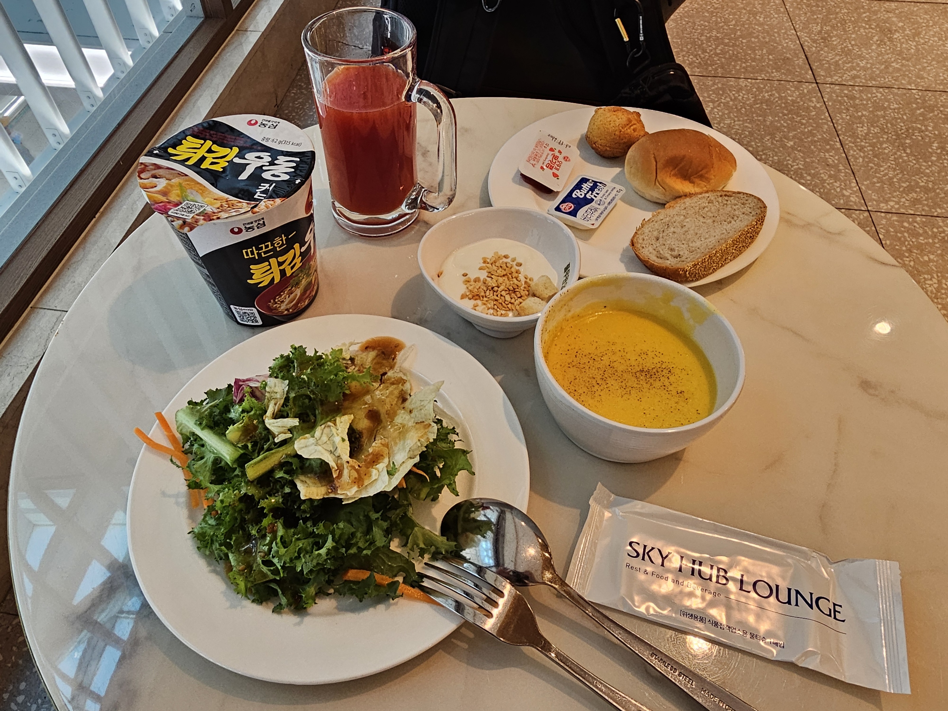 샐러드와 죽, 빵, 주스와 컵라면 하나는 먹어줘야 라운지 이용 한 것 같아서 냅다 챙겨 먹고 후다닥 나왔다.