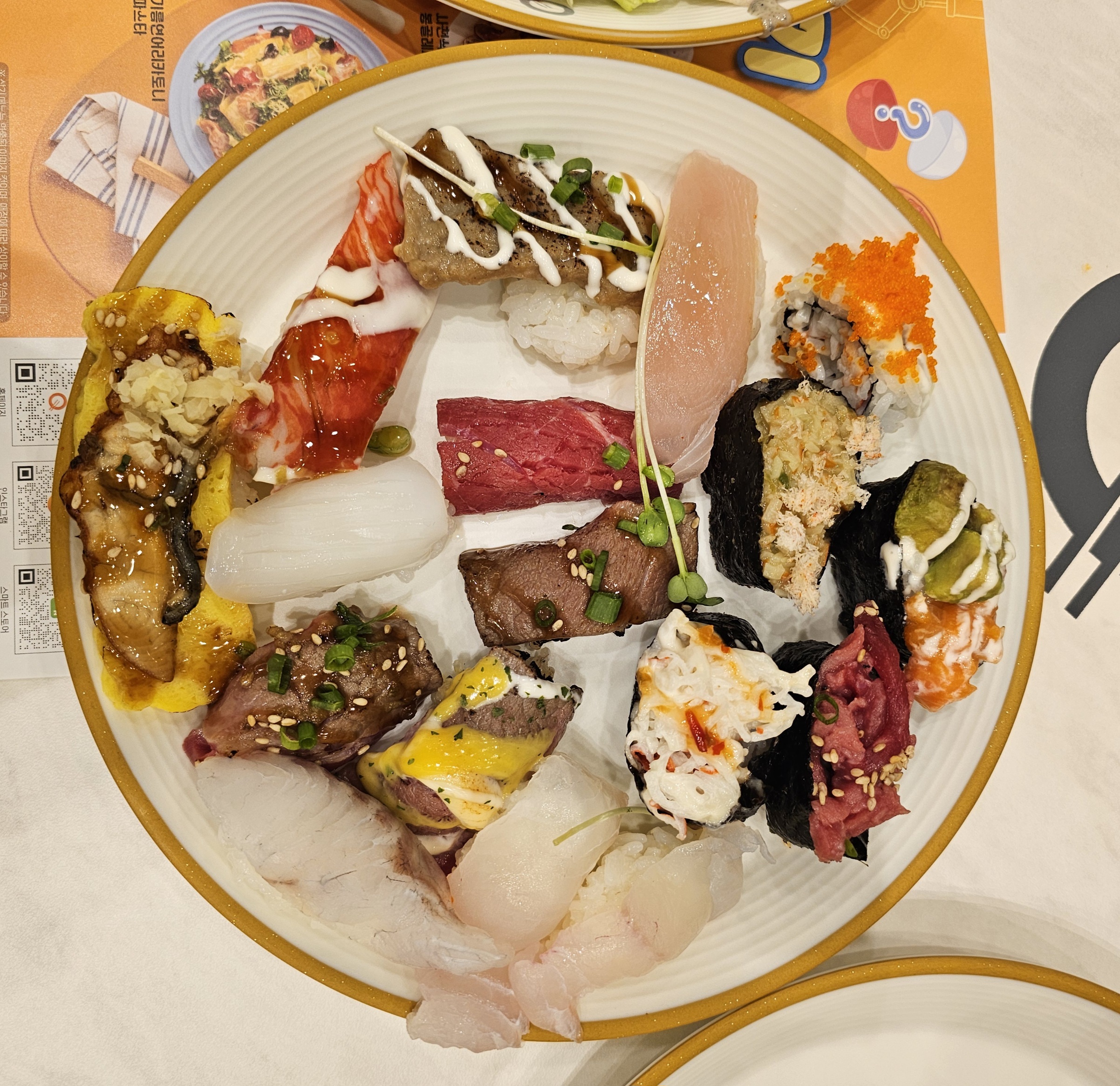 초밥이 메인이니 다 먹어보기 힘들 정도로 갖가지 초밥들이 있고 샐러드부터 디저트까지 일반적인 뷔페음식은 어지간한 종류는 다 있는 것 같다.